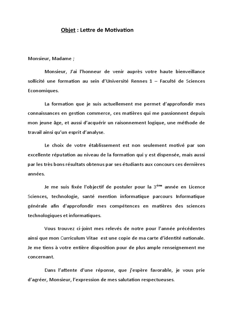 Nous attirons l'attention des candidat.e.s sur le fait que les deux sessions d'examens sont obligatoires ; Si tu souhaites postuler à une formation supérieure ou candidater pour un emploi, le plus souvent tu dois rédiger une lettre de motivation. Lettre de motivation pour une faculte ec gestion. Comme lorsque vous rendez votre copie lors d'un examen, la présentation et la lisibilité du texte comptent presque autant que le contenu. Ayant eu l'opportunité de parfaire ma connaissance de votre établissement via votre site internet, c'est avec intérêt que j'ai découvert que le programme très complet que vous proposiez était en totale adéquation avec mes attentes. Maybe you would like to learn more about one of these? Elle est censée également compléter ton cv. La plupart des grandes écoles, facultés, écoles spécialisées, organismes de formation demandent une lettre de motivation à joindre au dossier de candidature. Lettre de motivation pour intégrer une association. Appelée autrement lettre d'accompagnement, il s'agit d'un document qui doit mettre en valeur tes compétences et tes qualités. Vous devez convaincre que votre choix de formation est cohérent avec vos connaissances, vos qualités et vos projets ( les 25 détails à connaître avant d'écrire sa lettre de motivation ). Vous pouvez utiliser cette lettre de motivation faculté d économie et gestion pour l envoyer par la poste par votre propres moyens en vous déplaçant à la poste ou bien sans bouger de chez vous et rapidement grâce à merci facteur. Lettre de motivation pour un stage de bts.